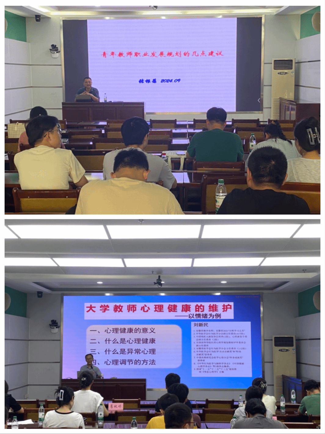 校关工委张根葆、刘新民分别就青年教师职业生涯规划、心理健康维护作专题讲座,勉励青年教师立足岗位,做好职业生涯规划,正确认识自己,增强自我成长的动力。