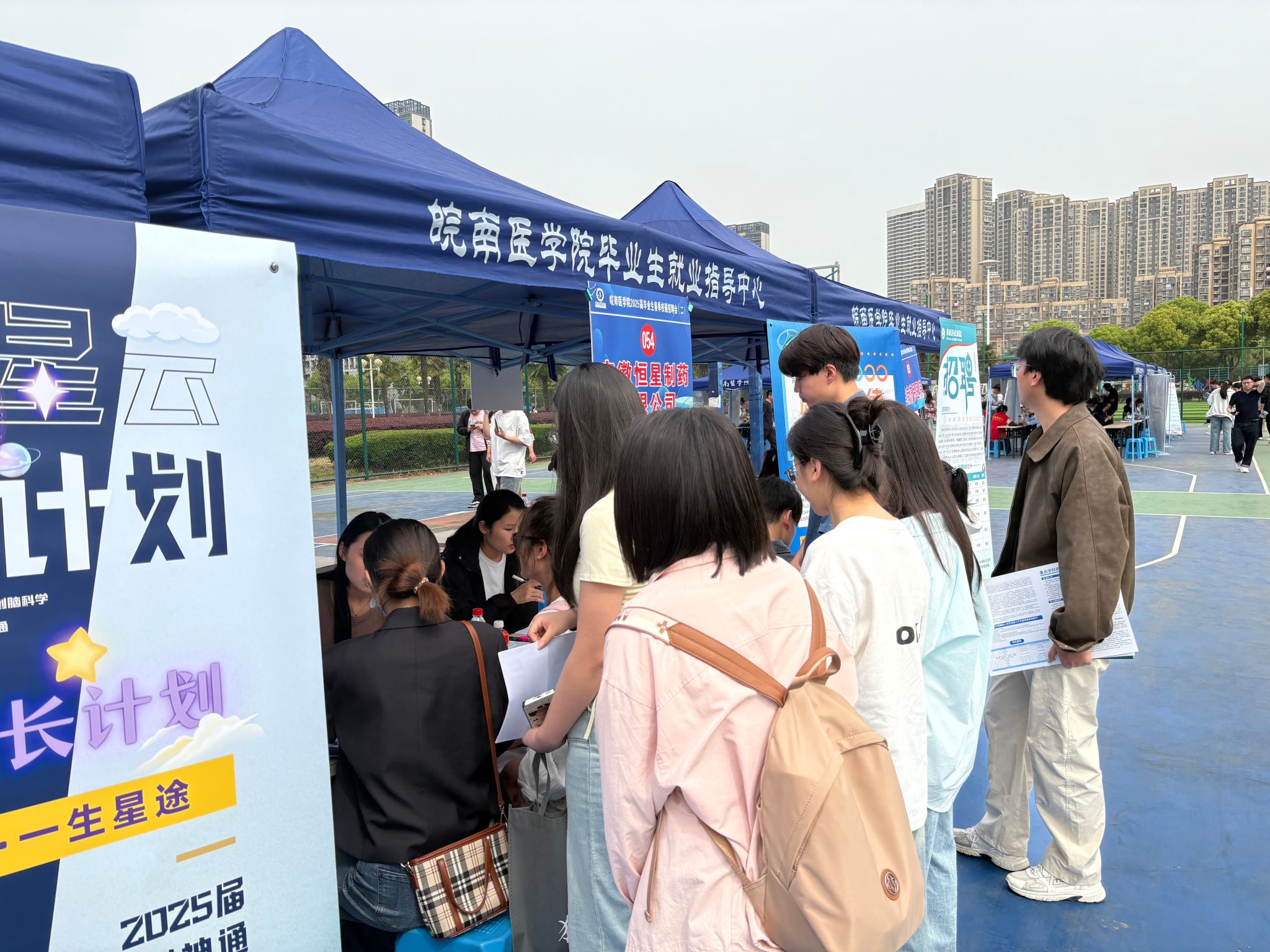 招聘会现场供需双方高效对接,展位前人头攒动,毕业生们手持精心准备的简历,与招聘人员深入交流。招聘单位展板前,学生们或驻足细读招聘信息,或三五成群讨论心仪岗位;招聘人员面带微笑,耐心解答疑问,详细讲解岗位需求与发展前景,双方交流互动,秩序井然。现场还邀请了安徽省卫生健康委员会和省内部分规培基地工作人员开展住院医师规范化培训招生咨询,同步举办了“筑梦青春 职通未来”生涯嘉年华活动。招聘会期间,中国人民解放军海军第九〇五医院等单位召开了校园专场宣讲会,岳西县中医院等多家用人单位采用专场笔试考核、结构化面试、协议签署的一站式招聘流程,通过效率提升、精准评估、成本节约和体验优化,实现了“快、准、省、优”的人才供需精准匹配。