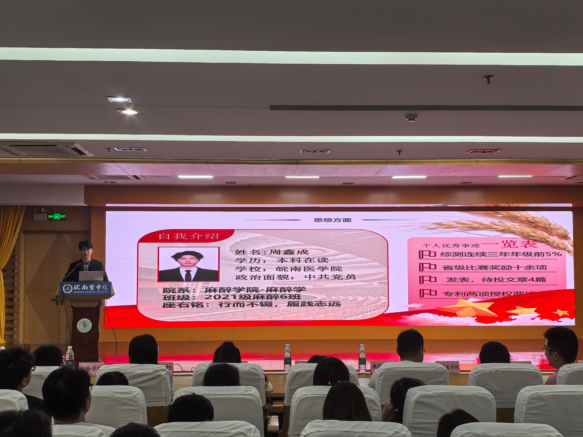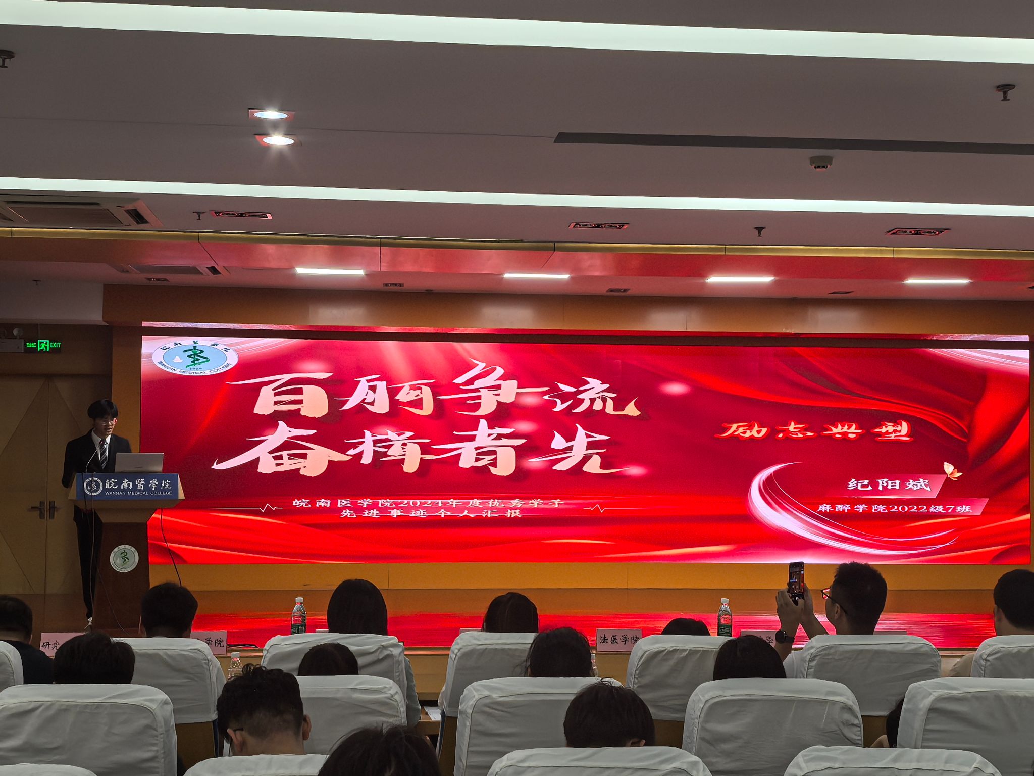 汇报现场,聚光灯下20名选手依次登台,通过PPT展示、主题演讲、舞台表演等多种形式,声情并茂地分享了他们的成长历程、奋斗故事、心路感悟与未来展望,亮点纷呈、催人奋进,展示了勤奋好学、全面发展、实践创新、自立自强、无私奉献的精神面貌。最终,吴蓓(法医学院)、邓奕(药学院)、黄宇(临床医学院)、纪阳斌(麻醉学院)、芮尔安(公共卫生学院)、王雨桐(临床医学院)、章译文(医学影像学院)、周鑫成(麻醉学院)、李苏慧(药学院)、胡静怡(口腔医学院)等10名同学凭借优异表现,拟获2024年度十大“优秀学子”荣誉称号。