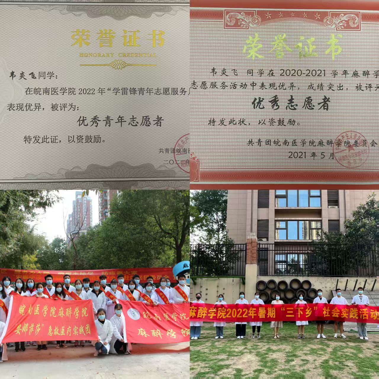 韦炎飞深谙“纸上得来终觉浅”,大学是连接象牙塔与社会的桥梁。他积极投身社会实践,学以致用,服务大众。在社区义诊的现场,他化身健康使者,运用所学知识为居民提供专业、耐心的健康咨询与基础检查,积极普及医学常识,传递科学健康理念。他亦是“急救知识传播者”,踊跃参与“心肺复苏知识进校园”活动,通过生动演示与清晰讲解,将生命的“黄金四分钟”急救技能传授给莘莘学子,播撒安全的种子,提升校园应急能力。因在志愿服务与社会实践中表现突出,他获校“优秀青年志愿者”、麻醉学院“优秀志愿者”称号及社会实践奖学金。这些躬身实践的足迹,不仅是将知识转化为能力的试金石,更让他深切体悟到医者的社会责任与奉献真谛,滋养了深厚的家国情怀与仁爱之心。