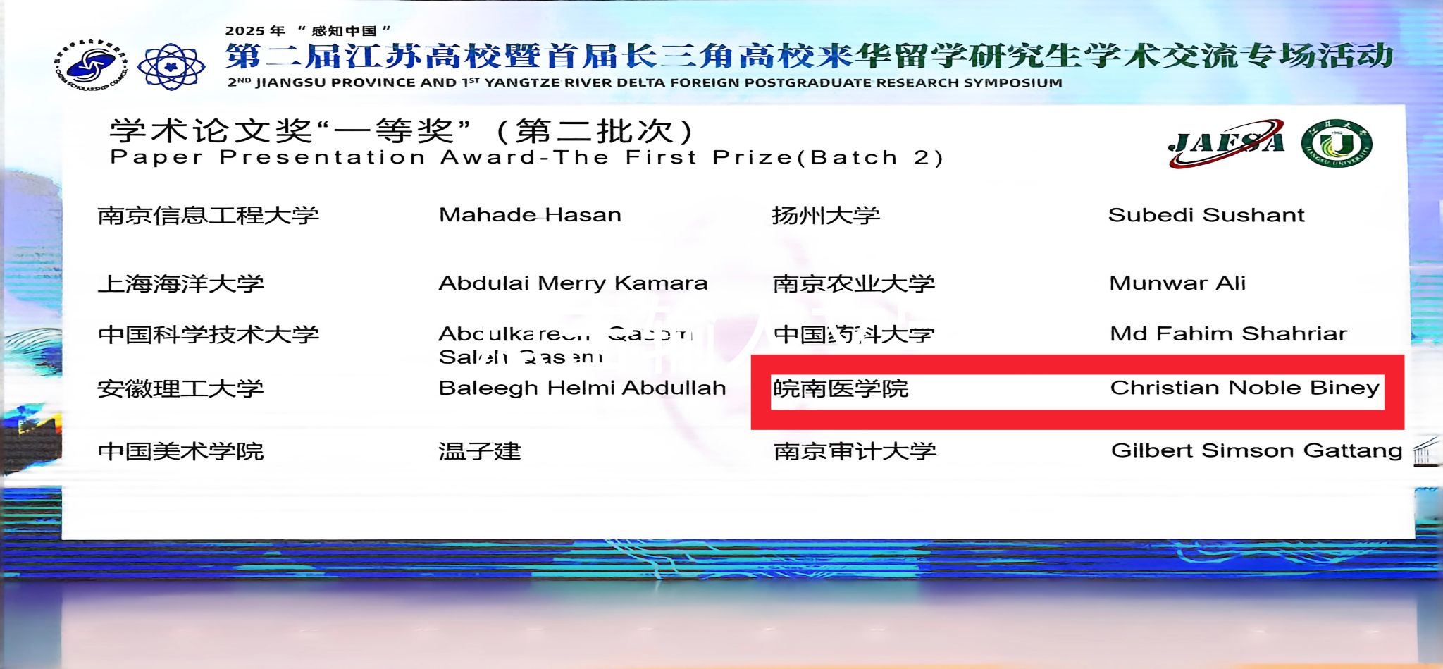 在这场汇聚长三角地区众多高校优秀学子的学术盛宴中,我校国际学生在张文众、査磊和杨竹三位老师的悉心指导下,凭借扎实的学术功底与出色的研究能力赢得评委的充分肯定,2024级公共卫生与预防医学专业永新、2024级临床医学专业思阳、2023级基础医学专业周慕汉分别获一、二、三等奖,充分展现了我校在国际学生培养及学术交流领域的突出成绩。