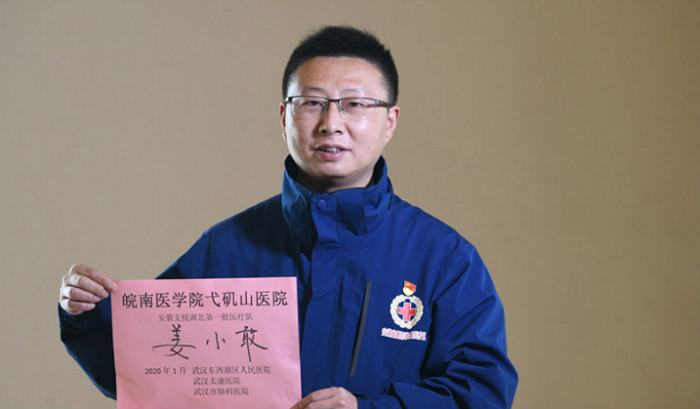 今年年初,一场突如其来的新冠肺炎疫情迅速蔓延,让本该欢乐祥和的春节蒙上了一层阴影。作为一名有二十年党龄的中共党员,姜小敢深知“疫情就是命令”所应履行的使命;作为一名有十几年临床经验的重症医生,他更懂得“防控就是责任”所赋予的担当。年三十匆忙回老家陪父母吃了个年夜饭,第二天,他便申请加入安徽省第一批支援湖北医疗队,与一群同样逆行的战友们踏上去往武汉的征程。