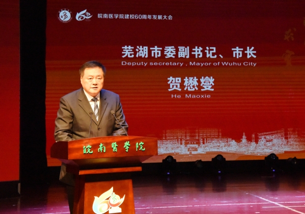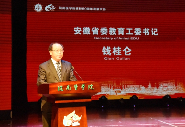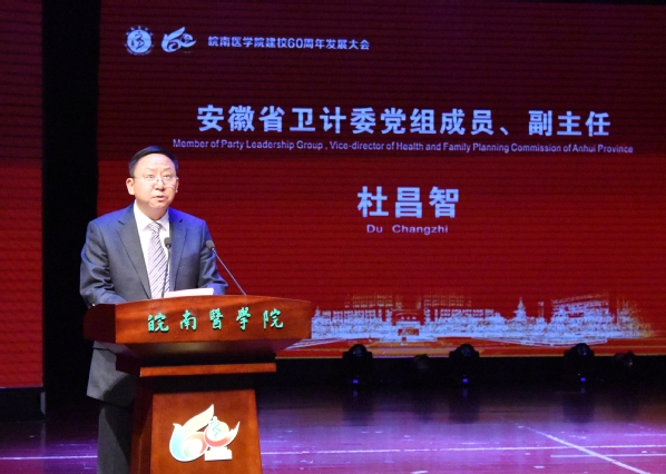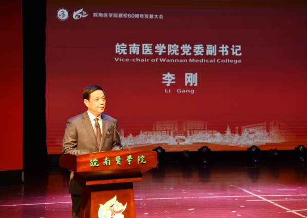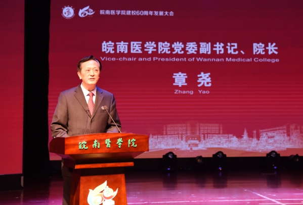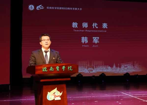 教师代表韩军教授代表学校全体教师发言,他回顾了在学校学习、工作和生活的点点滴滴,并表示,将以60周年校庆为全新起点,以团结创新的精神,传承皖医的光荣传统,培养好人才,建设好学校,用激情与汗水,用青春和热血,一路携手奋进,共筑皖医梦、大学梦,创造新的辉煌!