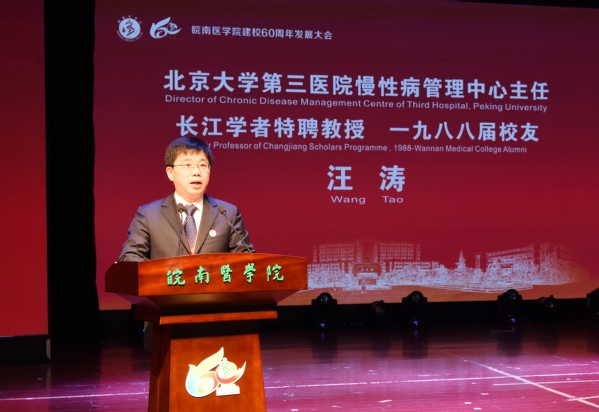 1988届校友、北京大学第三医院慢性病管理中心主任、博士生导师汪涛代表海内外的校友,向母校60华诞表示最热烈的祝贺!他深情地回顾了在母校的学习时光,表达了对母校悉心培养的感激之情。他表示,无论何时、无论身处何地,对母校的关注、情怀和感恩将始终不会改变,努力使母校精神薪火相传,并真情祝福母校更加繁荣、兴旺!